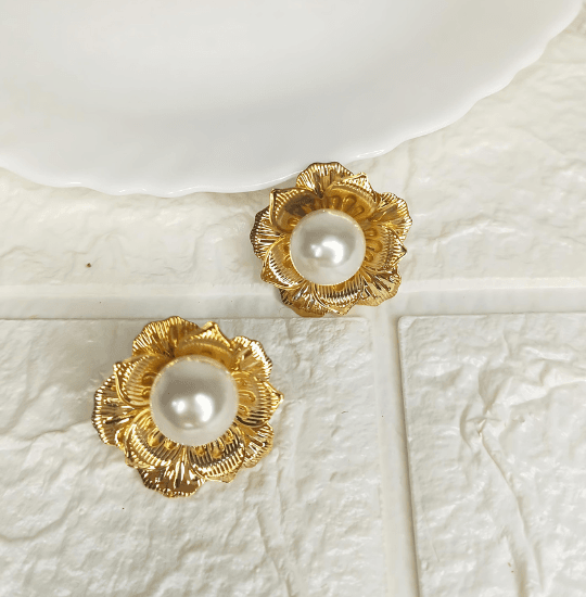 Luxury Golden Bloom Pearl Earrings, crafted with a refined gold flower design and a lustrous pearl center. These smaller, yet equally stunning earrings exude elegance and sophistication, adding a touch of timeless luxury to any occasion